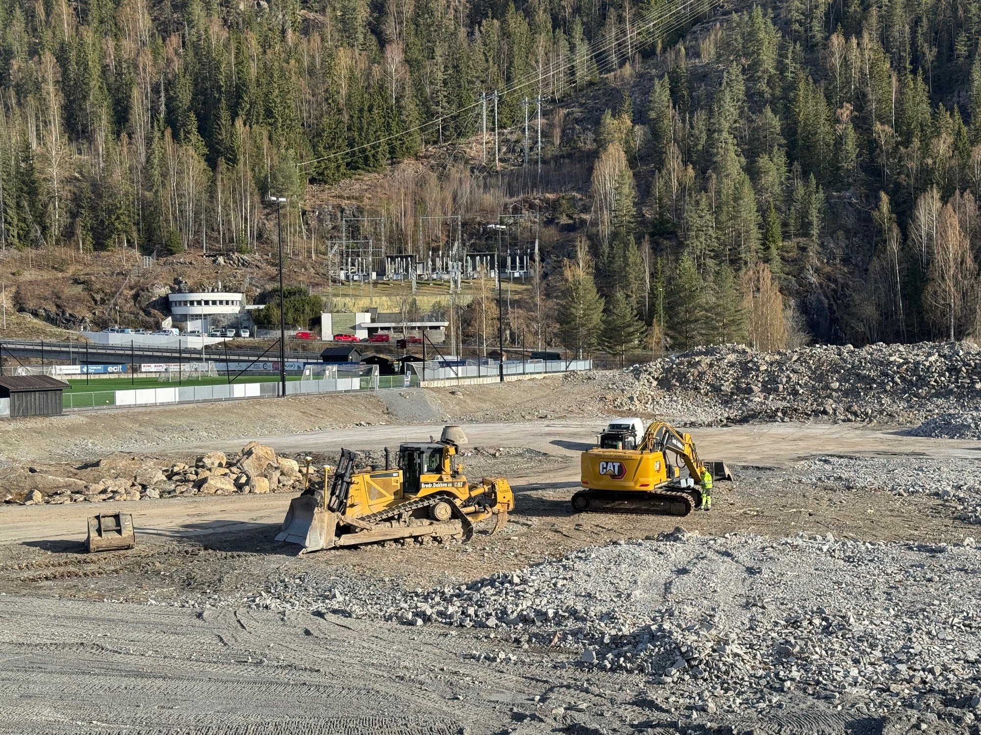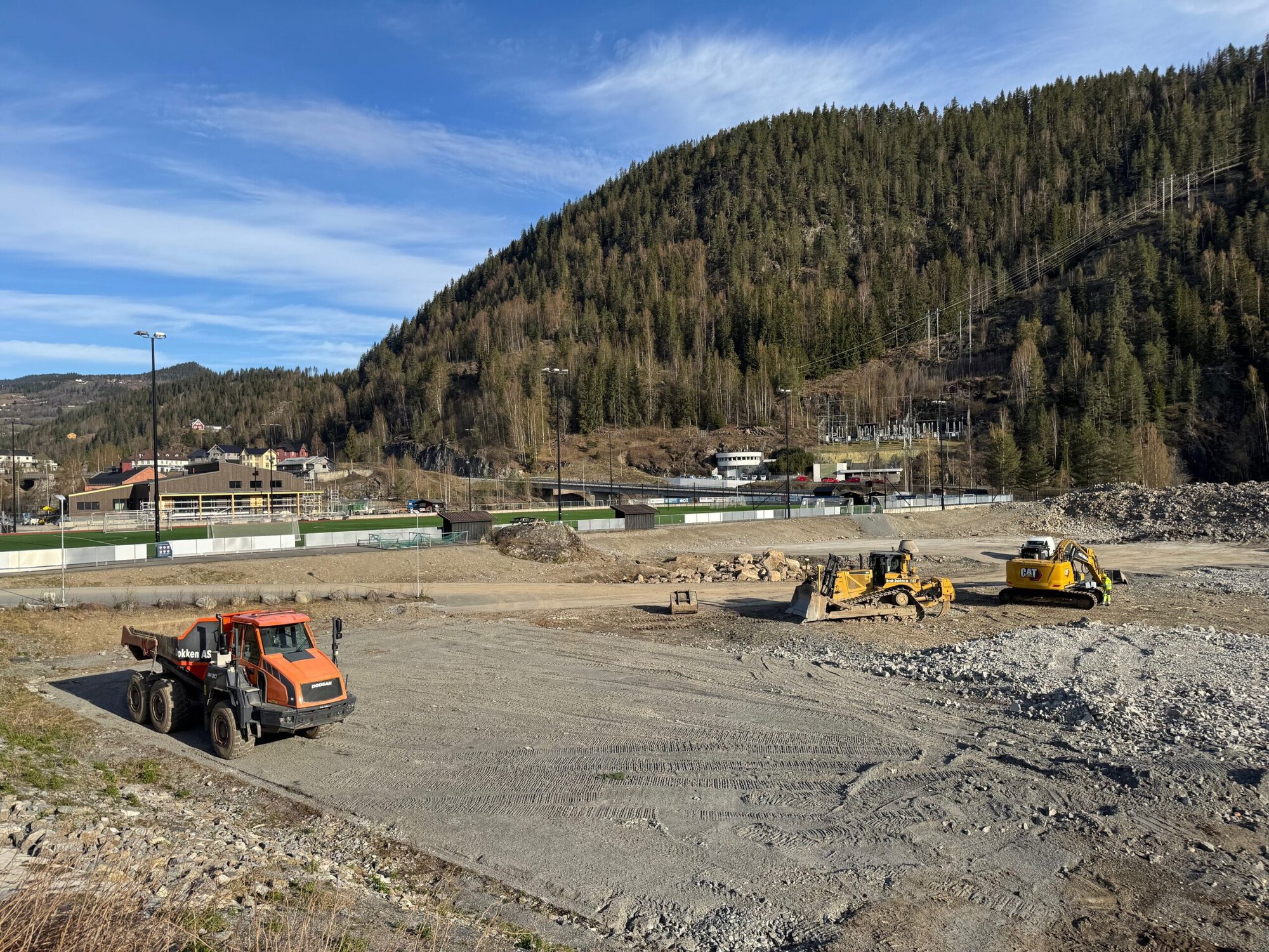 Arbeidet omfatter grunnarbeid for den nye ungdomsskolen. Her skal tomten grovplaneres, komprimeres og fylles opp.